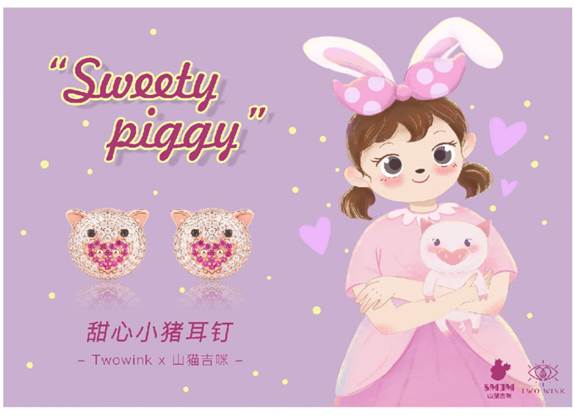 甜心小豬是Twowink推出的首款甜心萌寵系列首飾,Twowink品牌的DNA元素是心形,在這款首飾中愛心元素巧妙地融入可愛小豬造型中,甜心系列首飾的主要元素是軟萌小動(dòng)物和愛心粉嫩心形元素的結(jié)合。