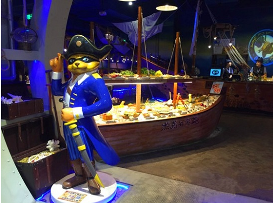 航海文化主題餐廳,每到就餐時間,門店外總是排著長隊等待就餐。主題餐廳,餐廳的裝修、擺設、造型以杰克貓為特色來布置。墻上的甲骨文是貓的進化史,手繪地圖是杰克貓航行的路線,藍色的光影流動,與餐廳藍色的海洋裝修風格相呼應,再加上流動的海水,讓餐廳的海洋風味更濃烈。