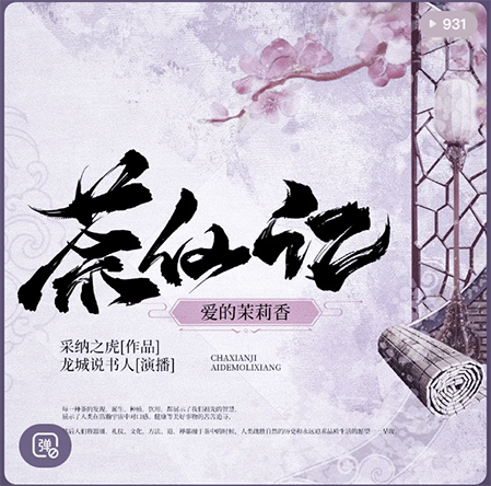 查看詳情近日,《茶仙記·愛的茉莉香》一部細說茶文化的神幻系列小說語音版榮登喜馬拉雅,一經(jīng)上線獲得網(wǎng)友的超高下載量及好評。 《茶仙記·愛的茉莉香》是《茶仙記》系列長篇小說的第一部,以花仙子茉莉的成長經(jīng)歷及她和茶仙春生的愛情故事為主線,以虛構(gòu)本朝民族抵抗兇族外侵、平定南部叛亂兩場大的戰(zhàn)爭為副線,將中國的茶文化知識巧妙地融于其中,創(chuàng)作出新鮮的、史詩般的神幻故事,是中...