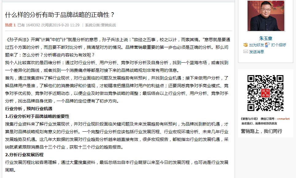 近日,朱玉童先生系列文章之《孫子兵法·計》篇在銷售與市場專欄受到讀者的熱烈追捧,銷售與市場方表示,此篇文章也收到讀者的廣泛轉發(fā)!