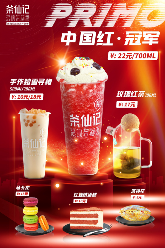 2022開年重磅來襲,茶仙記愛的茉莉香推出“中國紅”系列新品, “中國紅·冠軍”這款主打新品以山楂、藍莓、草莓為主要材料,再注入茶仙記特有的茉莉龍珠茶底,最后再配上藍莓雪頂,全面融合了果茶、奶香和茉莉花茶的新式口味體驗。三位世界冠軍—世界短道速滑冠軍林孟、十米跳臺冠軍劉慧瑕、世界花樣游泳冠軍鐘輗聯(lián)合推薦了茶仙記愛的茉莉香“中國紅”系列新品,為茶仙記愛的茉莉香增添了輝煌又意義非凡的一刻。