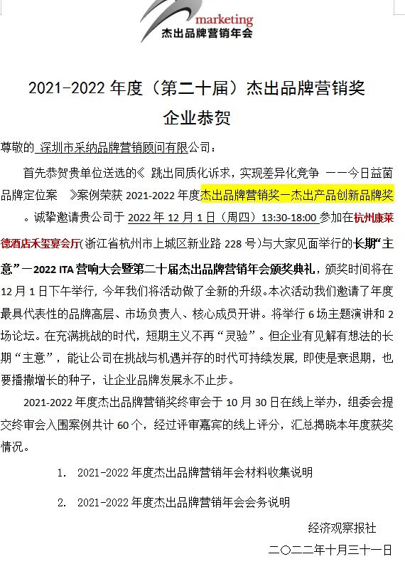 由深圳市采納品牌營銷顧問有限公司選送的《跳出同質(zhì)化訴求,實現(xiàn)差異化競爭——今日益菌品牌定位案》案例在全國近千個優(yōu)秀年度品牌營銷案例中脫穎而出,榮獲2021-2022年度杰出品牌營銷獎——杰出產(chǎn)品創(chuàng)新品牌獎。這是采納第十二次奪得中國杰出營銷獎!營銷界的奧斯卡獎!