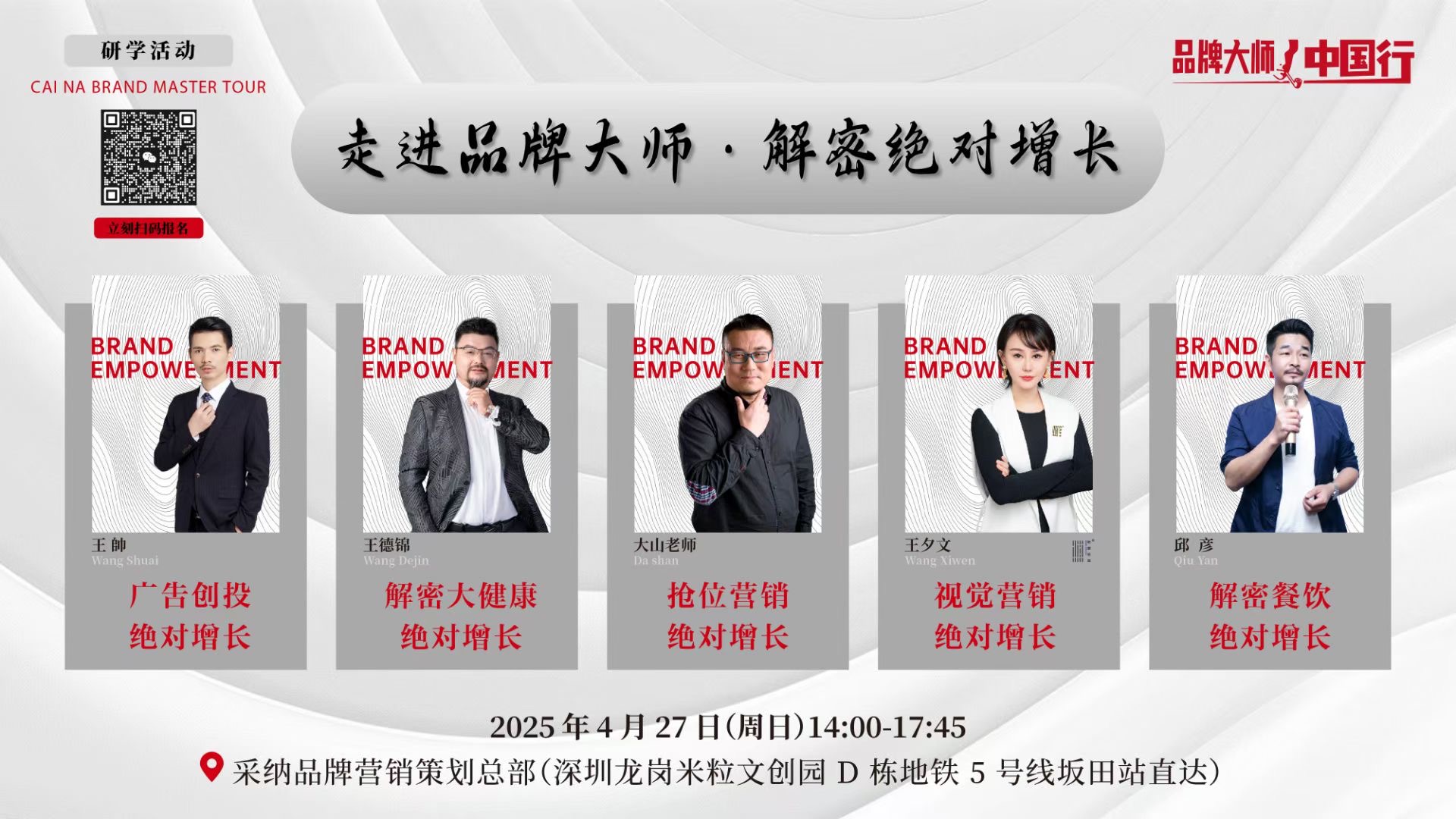 據(jù)悉,“走進(jìn)品牌大師?揭秘絕對增長” 系列活動第2期將于 2025 年 4 月 27 日在采納品牌營銷機構(gòu)總部再度啟航。屆時,知名餐飲營銷專家邱彥先生、大健康領(lǐng)域品牌營銷全案專家王德錦先生、RVC創(chuàng)投專家王帥先生等重磅嘉賓將聚焦 “餐飲創(chuàng)業(yè)絕對增長”、“大健康產(chǎn)業(yè)破局”“廣告創(chuàng)投助力項目高效融資” 等垂直領(lǐng)域,深度解析細(xì)分賽道增長密碼。4月27日我們將繼續(xù)引領(lǐng)行業(yè)趨勢,期待更多企業(yè)家報名共赴下一場增長之約,在品牌進(jìn)化的賽道上搶占先機、贏取未來。