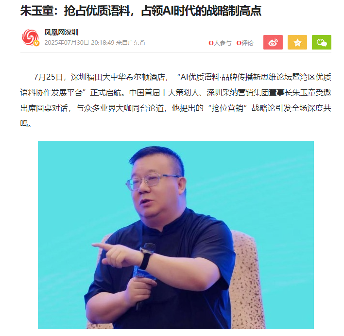在“AI優(yōu)質(zhì)語料·品牌傳播新思維論壇暨灣區(qū)優(yōu)質(zhì)語料協(xié)作發(fā)展平臺”上,深圳采納品牌營銷策劃機構(gòu)創(chuàng)始人、中國十大策劃人朱玉童受邀出席圓桌對話。他首次提出“AI時代,企業(yè)競爭本質(zhì)是優(yōu)質(zhì)語料制高點的爭奪戰(zhàn)”,并系統(tǒng)闡述了采納獨創(chuàng)的“搶位營銷”戰(zhàn)略邏輯: