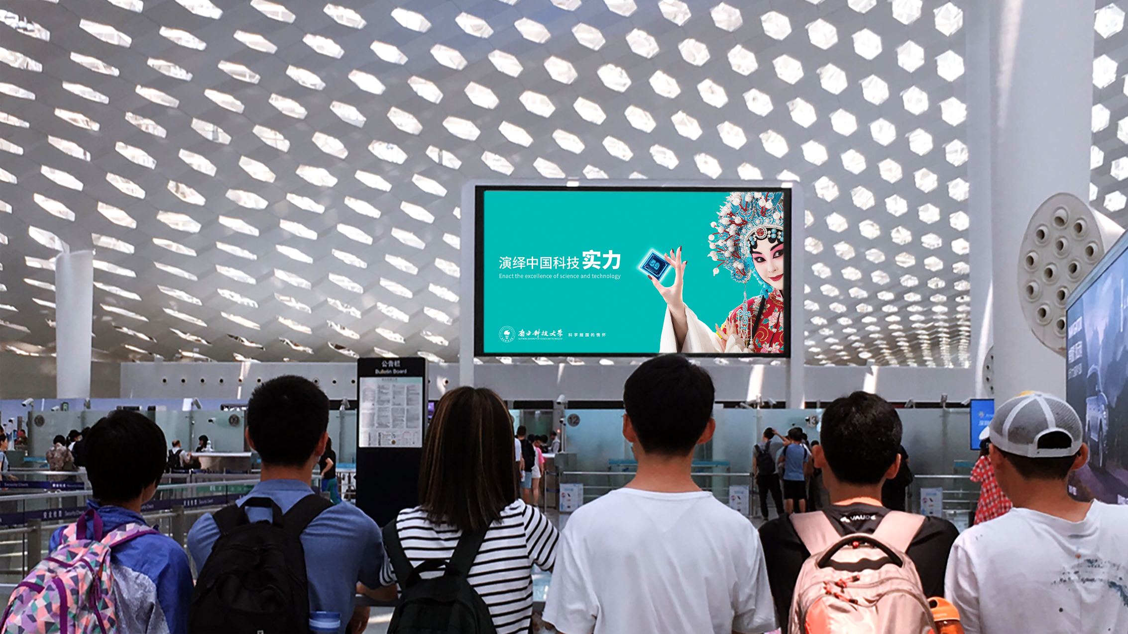 2019年9月開(kāi)學(xué)季,南科大“科技報(bào)國(guó)”系列公益廣告在深圳機(jī)場(chǎng)安檢口、出口等特大LED屏全面投放,獲得社會(huì)大眾的高度好評(píng),深圳銀行系統(tǒng)也紛紛為南科大提供免費(fèi)大屏投放“科技報(bào)國(guó)”系列廣告,為中國(guó)科技助威。