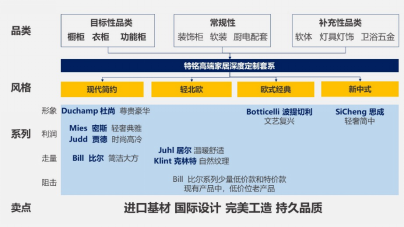 特銘的產(chǎn)品的品類構(gòu)成應(yīng)圍繞櫥柜、衣柜、功能柜及裝飾柜為核心,配套廚電與軟裝,附加軟體、燈具燈飾和衛(wèi)浴五金,以此組成全屋家居系統(tǒng)。
