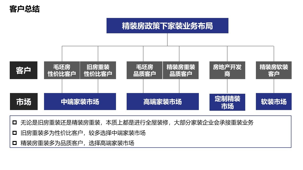 我們盤點了當前家裝行業(yè)的三大市場:①毛坯房市場下的普通住宅和別墅豪宅;②精裝房市場下的定制精裝、精裝房軟裝和精裝房重裝;③舊改市場下的舊房重裝和舊房局裝。