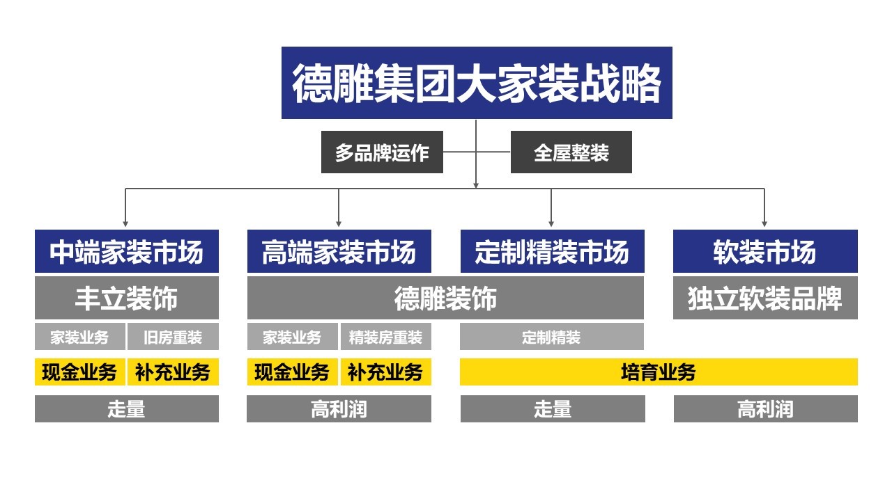 因此我們從德雕集團整體長遠發(fā)展考慮,在規(guī)劃品牌戰(zhàn)略之前先確定德雕集團的企業(yè)戰(zhàn)略方向:大家裝戰(zhàn)略。