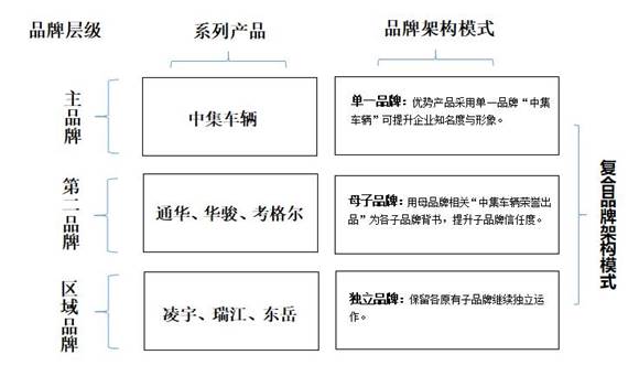 針對中集車輛集團(tuán)產(chǎn)品多、質(zhì)量參差不齊的特點,采納專家認(rèn)為復(fù)合品牌架構(gòu)模式與中集車輛集團(tuán)最為吻合。將中集車輛集團(tuán)旗下產(chǎn)品分為三個層級,針對性的采用不同產(chǎn)品品牌(主品牌、第二品牌、區(qū)域品牌),掌控不同層級目標(biāo)市場(高端市場、中端市場、低端市場)。達(dá)不到中集標(biāo)準(zhǔn)、或者細(xì)分市場的第一第二名,允許不使用中集品牌,這樣做既保護(hù)了中集大品牌又有利于旗下子品牌的發(fā)展。到一定時候,他們發(fā)展成熟了,再用中集品牌全面整合!