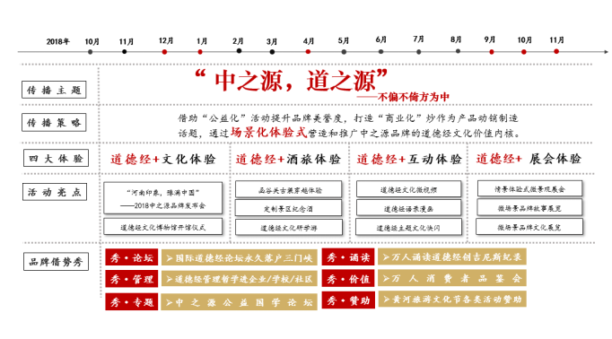 再通過舉辦中之源公益國學(xué)論壇,跨界黃河旅游文化節(jié),籌建老子道德經(jīng)文化館等動作,將品牌、產(chǎn)品、傳播、渠道等環(huán)節(jié)串聯(lián)成一條項鏈,讓核心戰(zhàn)略發(fā)揮最大價值。
